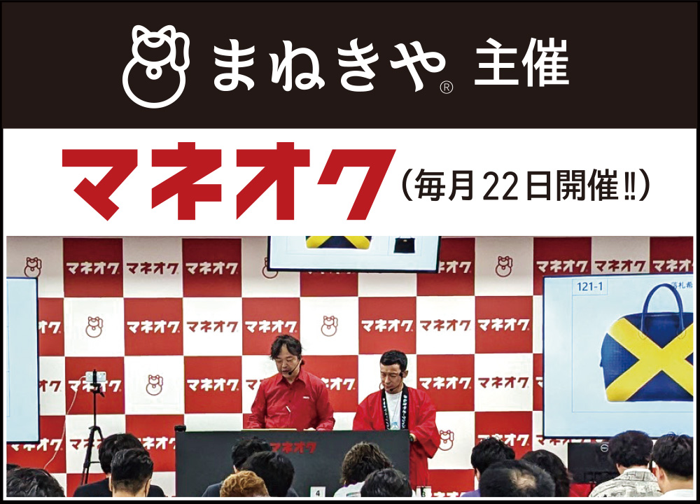 自社主催の「まねきやオークション(マネオク)」を毎月開催。全世界のバイヤーが参加するため、高額取引が可能です。加盟店様には手数料優遇もあり、粗利の最大化を支援します。