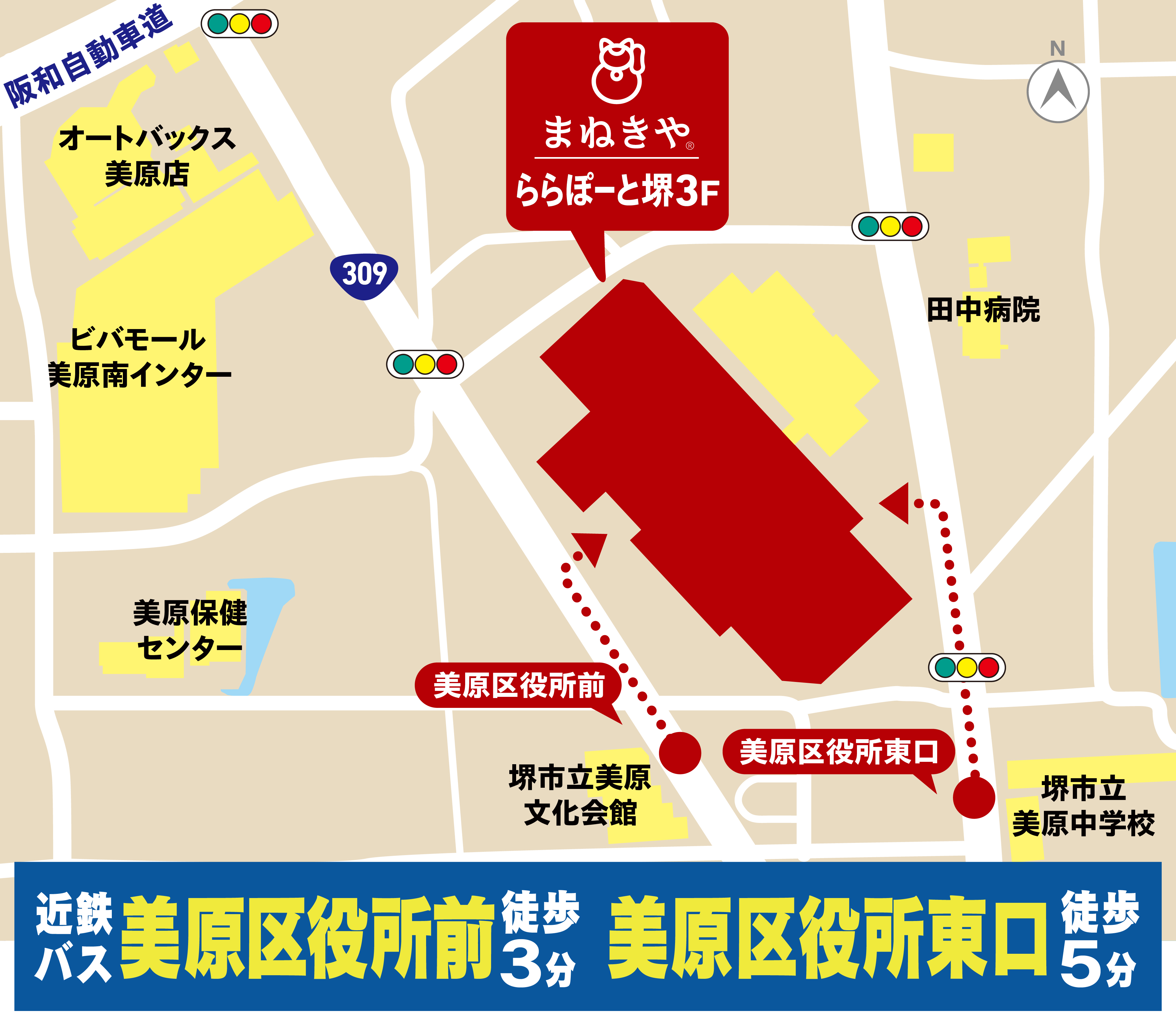 ●近鉄南大阪線「河内松原駅」下車、近鉄バス(余部行き/平尾道行き)約18分「美原区役所東口」下車徒歩約5分 、 又は近鉄バス(さつき野東行き)約13分「美原区役所前」下車徒歩約3分